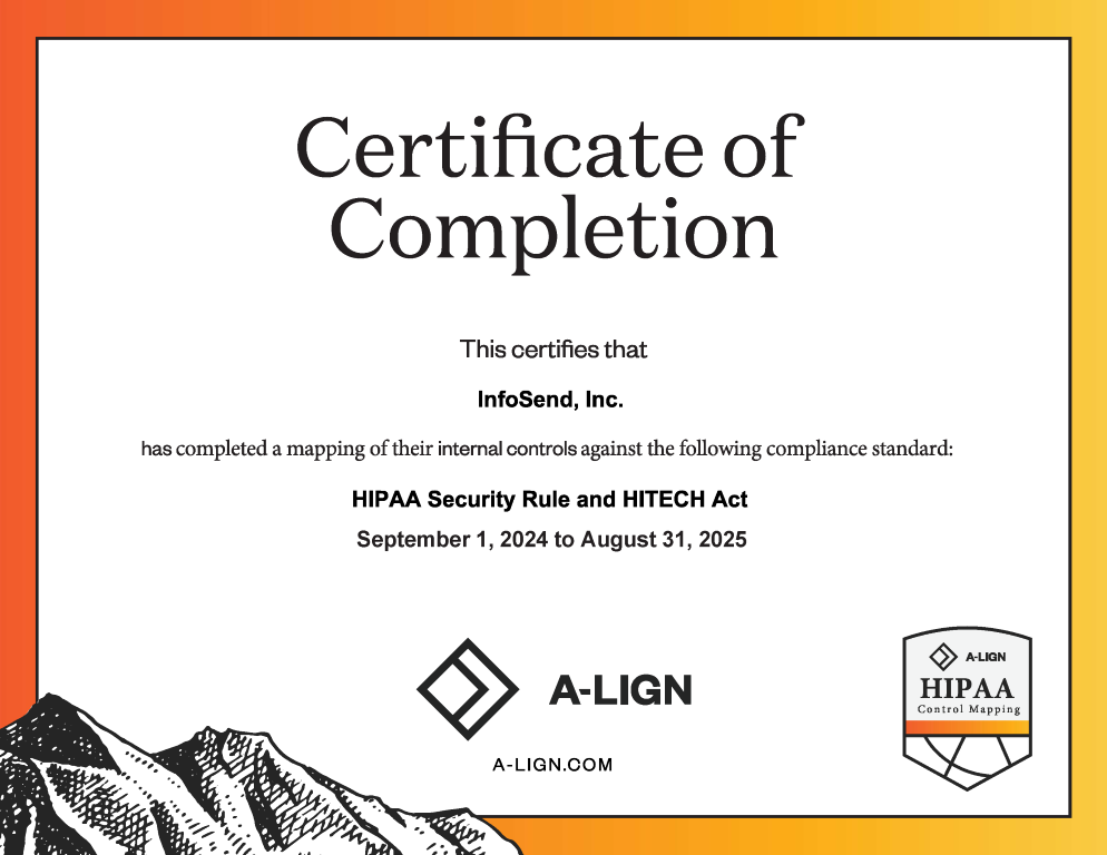 InfoSend undergoes annual HIPAA and SOC 2 Type 2 audits performed by a professional auditing firm. Links to certifications below: