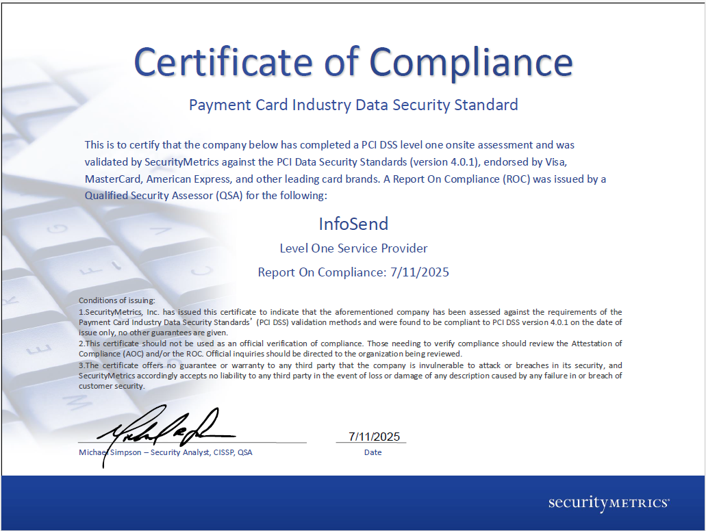 Click on the image below to view InfoSend's current PCI Certificate of Compliance. A qualified third party auditor annually ensures that PCI regulations are being followed.